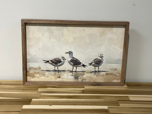 Only 2 left!Natural walnut frame with inset printed coastal-inspired design. Three seagulls in the tide. 16” x 10”