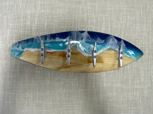 Only 1 left!Handmade surfboard shape towel rack. Wood with resin pour over top. 4 silver cast iron cleat hooks. 24”x8”