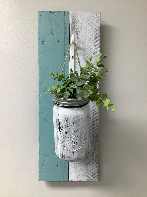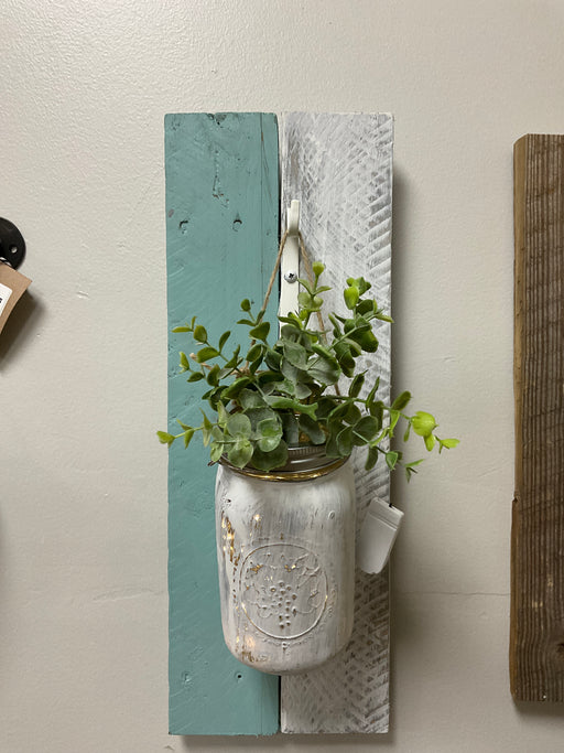 Only 1 left!Distressed wood boards with white hanging hook. Mason jar distressed in white with light up lights. Hand crafted and includes wall hangers. 7”x20”