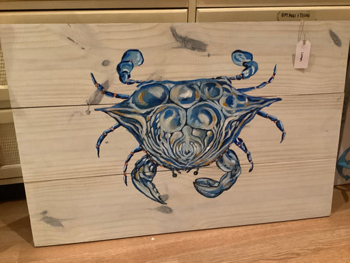 Only 1 left!Local artist hand painted blue crab on distressed wood boards. 34”x22”