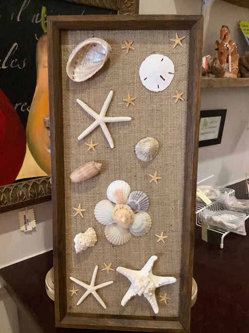 Only 1 left!Shells and starfish on burlap with a frame. 9”x20”