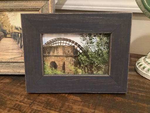 Only 1 left!4"x6" blue wood easel frame. Picture of wood water wheel in Cordoba Spain