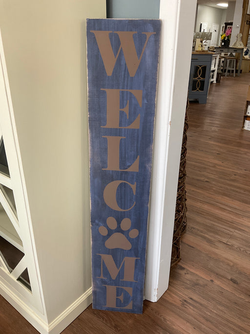Only 1 left!Welcome sign, puppy paw, wood, hand painted, 9”x48”, blue distressed, brown letters