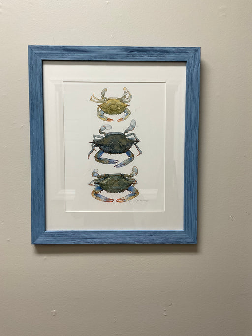 Only 1 left!Watercolor crab print mated in a light blue wooden frame 18" x 21”