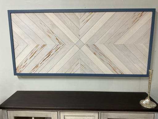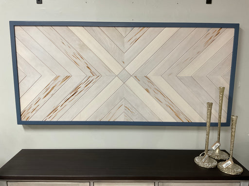 Only 1 left!Wall art, Cypress wood inlaid herringbone pattern, framed in navy, 64” x 30” x 2”, distressed - whitewash, handcrafted