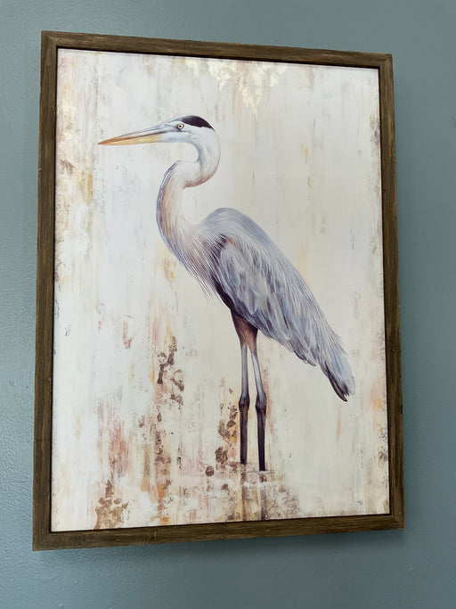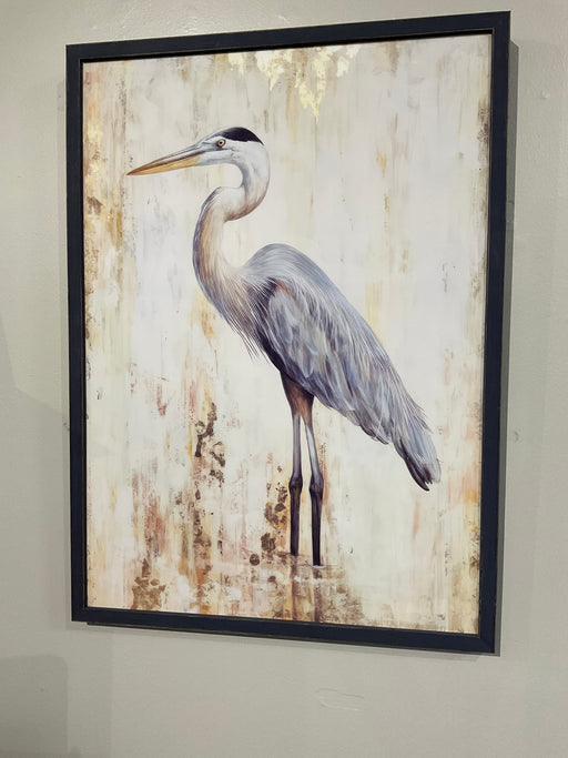 Only 1 left!Blue heron picture on canvas with wood frame, 21” x 29”