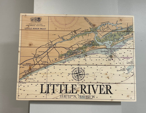 Only 3 left!Wooden map of Little River laser printed on pine wood boards. Heavy duty wire hanger. 24"x18"