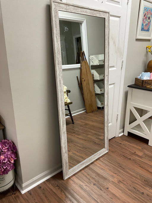 Only 1 left!Mirror with wood frame with edge, finished in a distressed white. Can hang horizontal or vertical. 29"x65"