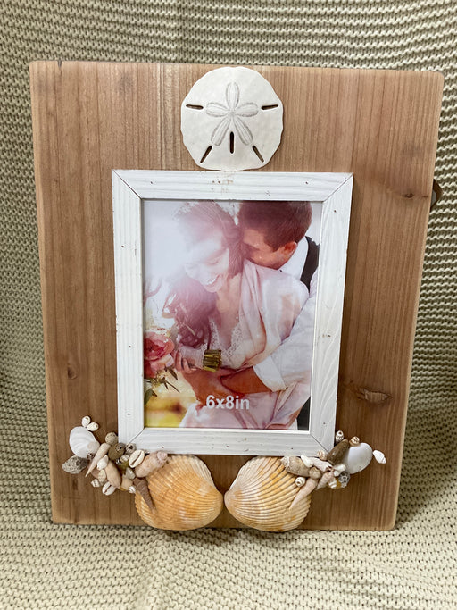 Only 1 left!Wood picture frame hand decorated with seashells, overall 15” x 12”, holds 6 x 8” photo. Natural wood tone and white, stand up frame.