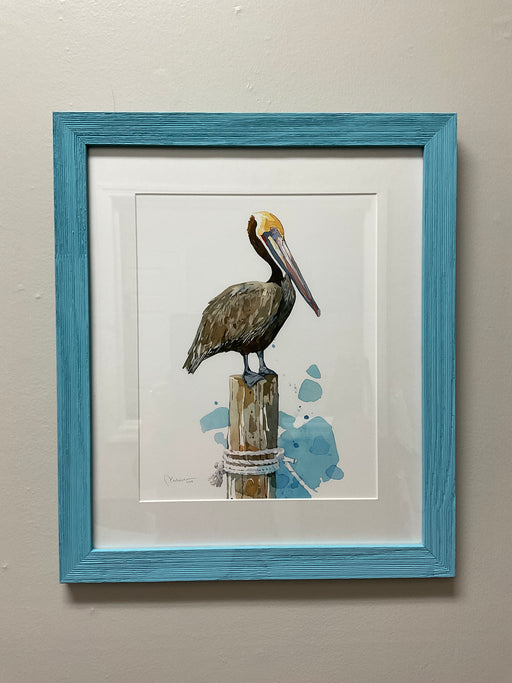 Only 1 left!Watercolor print of Pelican sitting on piling, mated in a turquoise wooden frame 18” x 21”