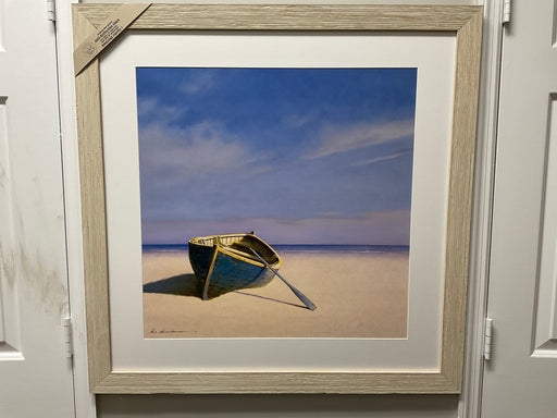 Only 1 left!33.5” x 33.5” Blue boat on beach. Whitewash wooden frame with anti reflective glass.k