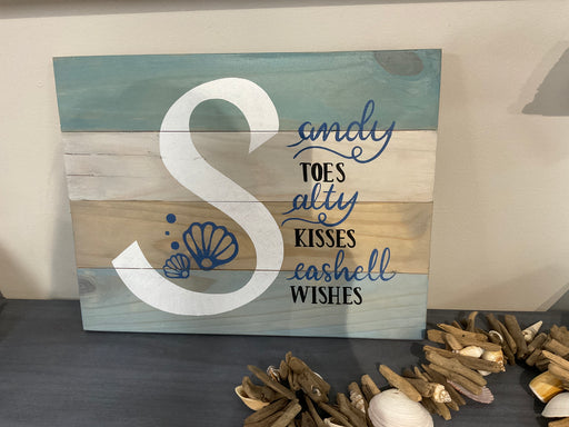 Only 1 left!Wood sign hand painted, Sandy toes salty kisses seashell kisses, 18" x 14”, blue and natural