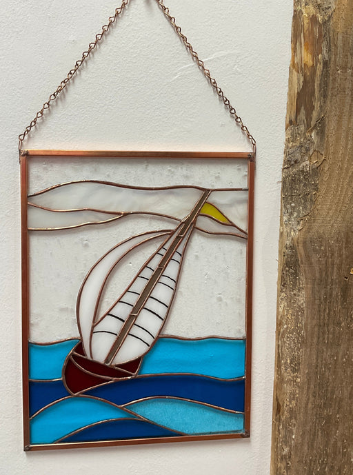 Only 1 left!Local artist crafted stained glass sailboat wall art with copper chain hanger. 9 x 11”