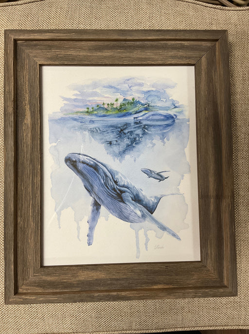 Only 1 left!Blue Whales with island watercolor, brown solid wooden frame 11”x13”