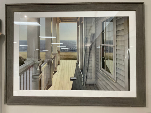 Only 1 left!Daniel Pollera framed and matted Porch view/ocean print, weathered gray wood frame, with anti-reflective glass 33" x 45”