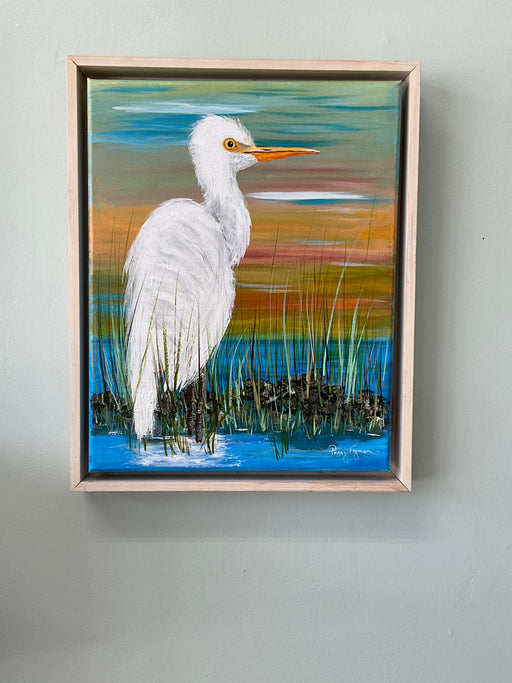 Only 1 left!Shadow box wood framed acrylic painting - heron by local artist Penny F. - 12 1/2” x 15 1/2”