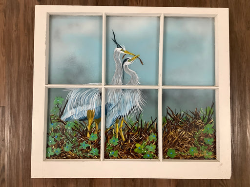 Only 1 left!6 pane vintage window with a painting of a pair of herons in the marsh done by a local artist. 32 x 28”