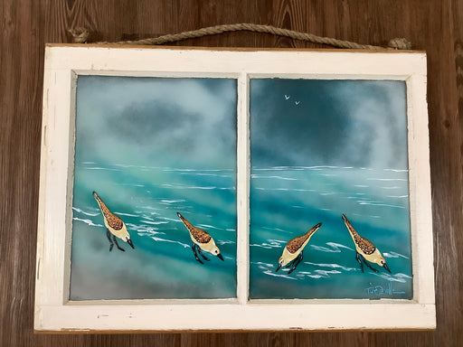 Only 1 left!Vintage 2 pane window with rope hanger, painting of sand pipers on the beach by local artist. 27 x 20”