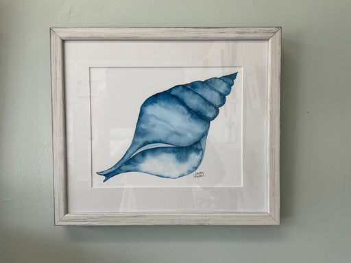 Only 1 left!Watercolor print blue tulip shell in white washed wood frame - 14 1/2” x 12 1/2”