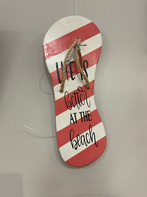 Only 1 left!Hand made and painted wood flip flop. Coral and white striped with the saying “Life is better at the beach”. 9” x 23”