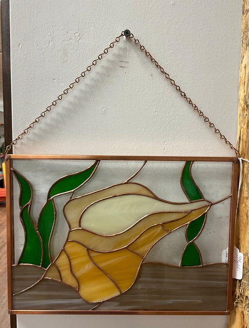 Only 1 left!Stained glass window - Gold and white whelk shell with seaweed outlined in copper. Hand Made by local Artist. 8 1/4” x 11 1/2”