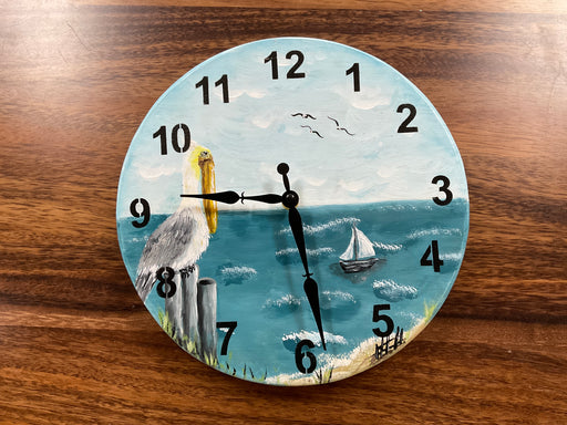 Only 1 left!Pelican and beach scene painted on round wood clock by local artist. Uses one AA battery. 12” diameter.