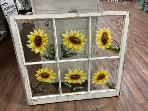 Only 1 left!Sun flowers hand painted on old window. 32” x 36”