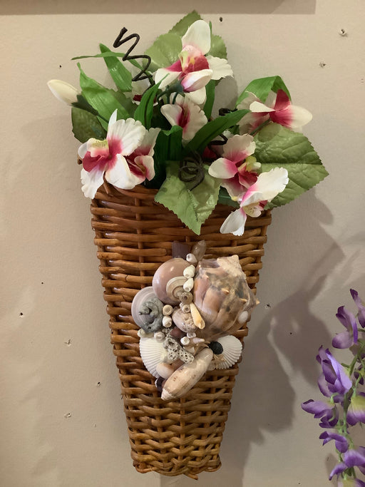 Only 1 left!Wicker wall basket decorated with shells and faux flowers. 7”x16”