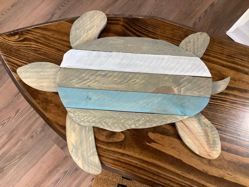 Only 2 left!Hand made and painted Pallet Wood turtle. Painted/stained and distressed in various colors. Includes wall hanger. 22”x18”
