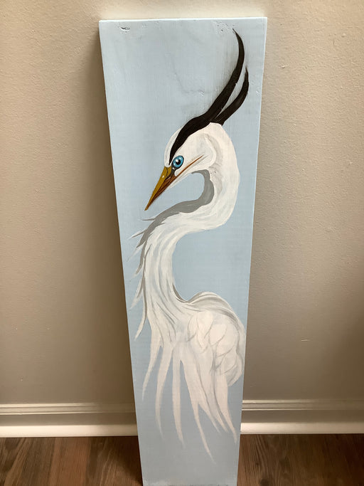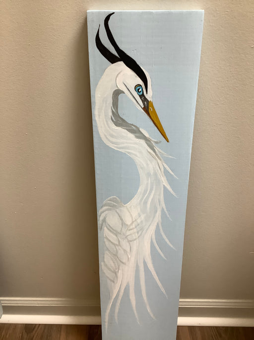 Only 1 left!Hand painted egret on a wood board. 7"x32"