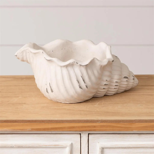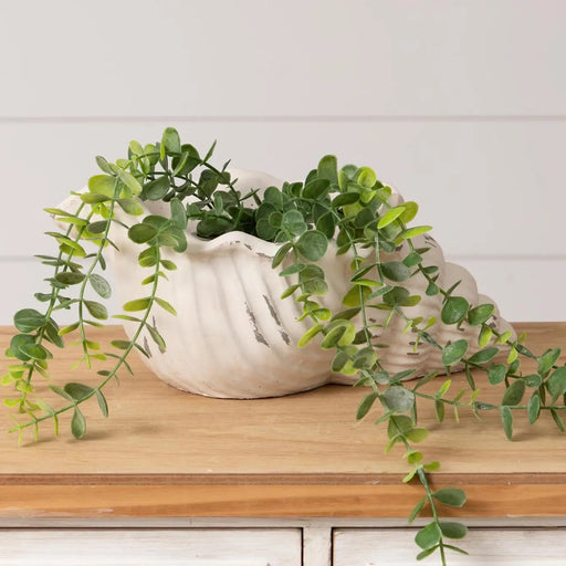 Only 1 left!Cement planter in the shape of conch shell and distressed. Greens not included. 5" H x 7" W x 12.75" D