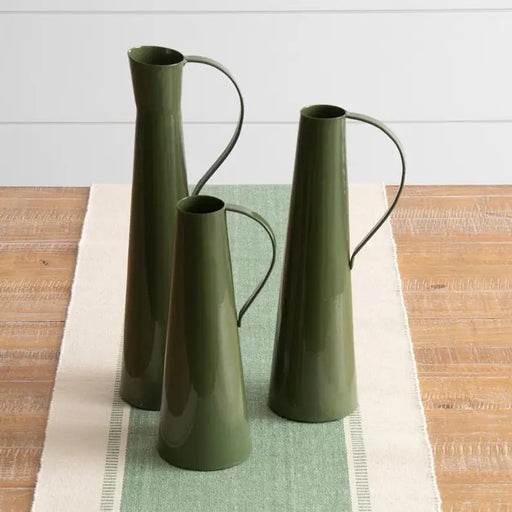 Only 1 left!Tall skinny metal pitchers in green. 3 sizes