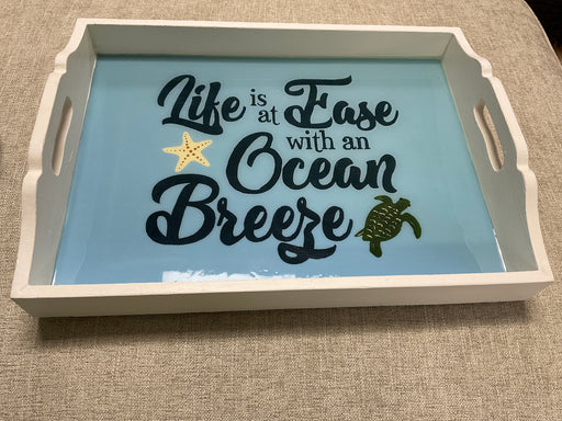 Only 1 left!Wood serving tray with handles painted white. Bottom painted with “Life is at Ease with an Ocean Breeze” and sealed with resin. 20” x 2.5” x 14.5”