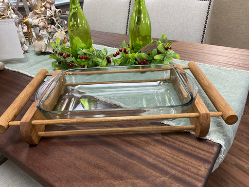 Only 1 left!Wooden serving tray to hold hot casserole dish. 19”x11”x3”. Glass baking dish included 9"x12"