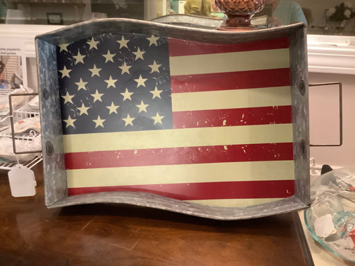 Only 1 left!Metal serving tray with distressed flag on bottom 22 x 12”