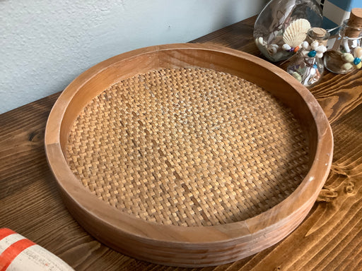 Only 1 left!Wood round tray with cane bottom. Light wood color. 12” round