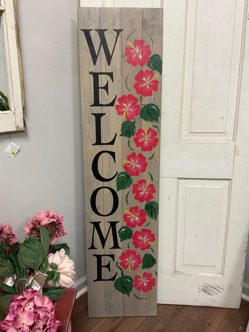 Only 1 left!Hand made and painted wood standing sign. Welcome in black letters on a driftwood color background and red colored Hibiscus flowers. 14” x 57”