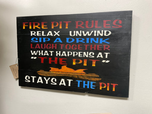 Only 1 left!Hand made and painted wood sign. Fire Pit Rules. Includes wall hanger. 17.5” x 13.5”