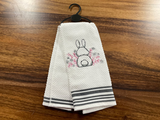 Only 1 left!Easter dish towels, 16” x 26”, cotton, embroidered bunnies, white with gray stripes