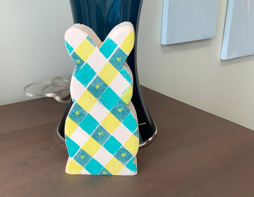 Only 1 left!Hand made wooden bunny in various plaid pattern colors with bow and flowers. 7.5” x 2” x 7”